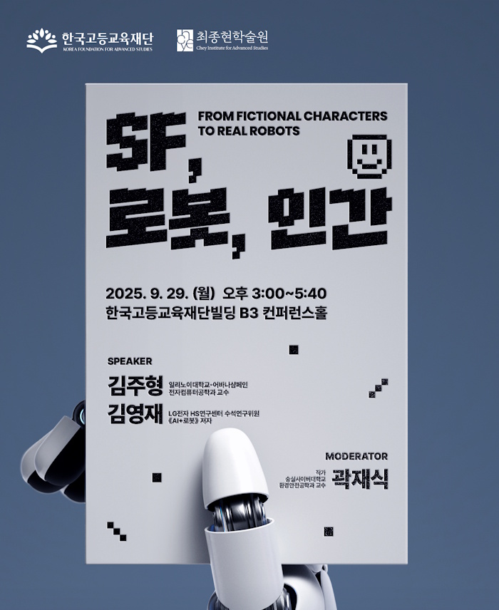 🙋🏻♂️ 김영재 LG전자 수석연구위원(해외유학 24기), 김주형 미국 UIUC 교수 지난 9월 29일, 최종현학술원과 한국고등교육재단이 특별 강연 〈SF, 로봇, 인간〉을 함께 마련했습니다. 세계 최대 로봇 학회인 Humanoids 2025가 서울에서 열리던 주간에 맞춰 진행된 이번 행사는 연구자와 산업 전문가, SF 작가가 한자리에 모여 로봇과 인간의 관계를 상상력과 인간 이해라는 키워드로 다채롭게 풀어내는 자리였습니다. 행사가 끝난 후 로봇 분야에서 학업을 이어가고 있는 재단 후배 장학생이 직접 연사들을 만나 이들의 이야기를 들어봤습니다. |