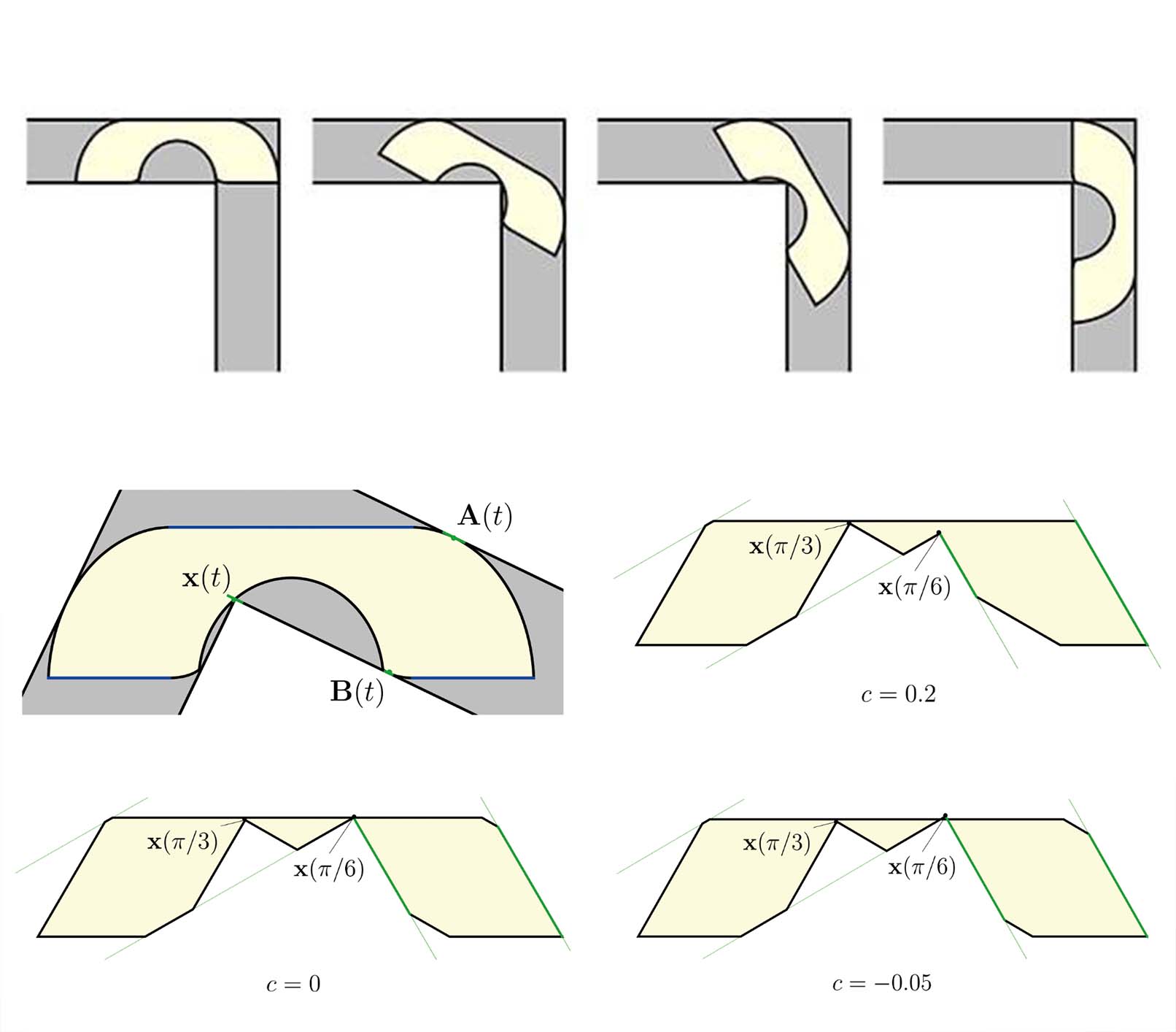 너비가 1m인 ㄱ자 모양의 2차원 복도가 있다고 가정해보겠습니다. 이 복도를 통과할 수 있는 도형 중에서, 넓이가 최대가 되는 모양은 무엇인가를 묻는 문제입니다.